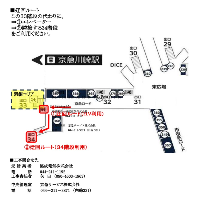 S33階段地上部照明器具不点に伴う工事のため、下記の期間中は階段とエスカレーターは ご利用いただけません。 上記画像の迂回ルートをご利用くださいますようご理解とご協力をお願いいたします。 【閉鎖期間】 2026年3月17日(火)22:00~3月18日(水)5:00 【工事問合せ先】 元請業者 協成電気株式会社 電話 044-211-1192 中央管理室 京急サービス株式会社 電話 044-211-3871(内線321)