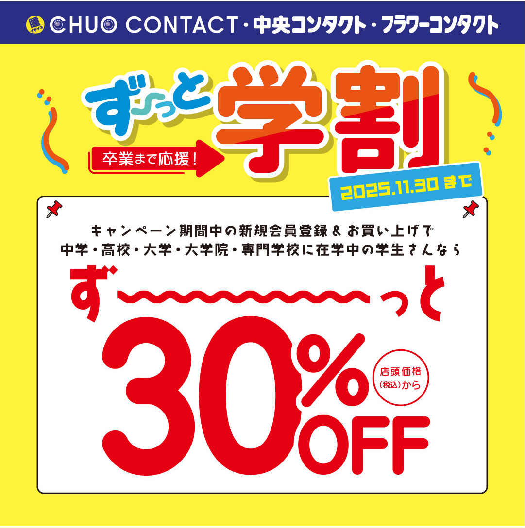 中央コンタクトをご利用頂いている中学・高校・大学・大学院・専門学校に在学中の学生さんならずーっと30%off