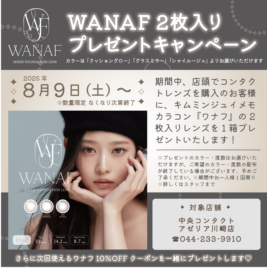 コンタクトレンズを購入したお客様にWANAF 2枚入りレンズを1箱プレゼント!