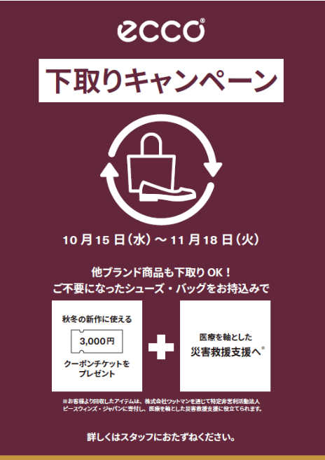 ご不要になったシューズ・バックをお持ち込みで1点につき3,000円お買い物券と交換。