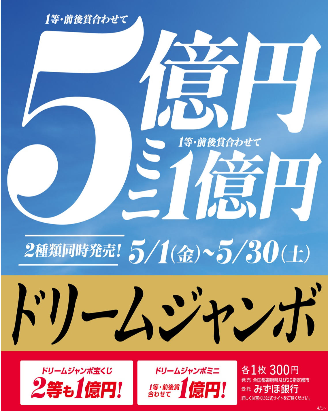 宝くじチャンスセンターでは5月1日から5月30日まで、2種類の『ドリームジャンボ宝くじ』を同時発売。