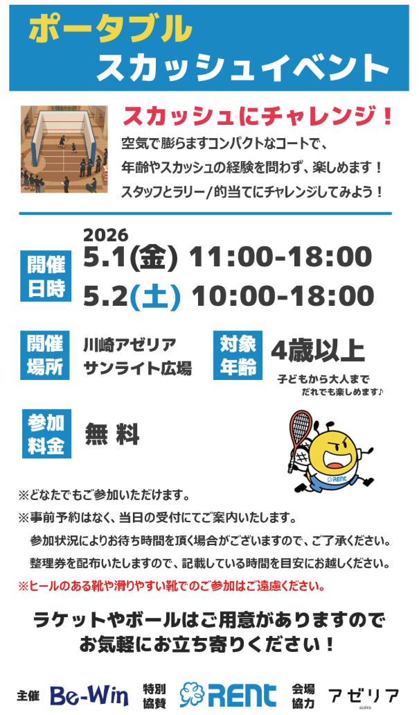 日本のトップ選手を招き、空気で膨らませるスカッシュコートを使ってスカッシュの疑似体験ができるイベントを開催します。